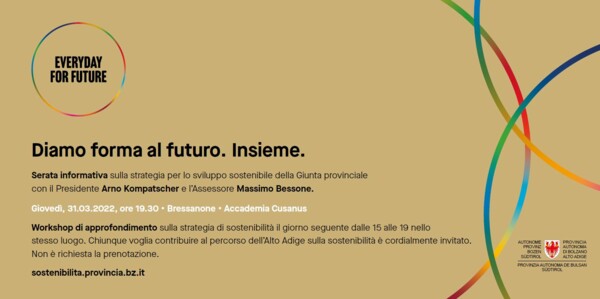 A luglio 2021 la Giunta provinciale ha lanciato la strategia per lo sviluppo sostenibile dell'Alto Adige che sarà in tour in tutto il territorio provinciale, a partire dal 8 marzo, con una serie di azioni partecipative all'insegna del motto “Insieme per dare forma al futuro. La presentazione dei principali contenuti di questo progetto in evoluzione è prevista fino al 7 aprile. Nel frattempo verranno raccolte ulteriori idee e suggerimenti, proposti dalla cittadinanza, per un futuro sostenibile. Invitando alla partecipazione, il presidente della Provincia Kompatscher sottolinea che “attraverso un dialogo costruttivo assumiamo insieme la responsabilità dell'Alto Adige e di uno sviluppo sostenibile per il futuro”.